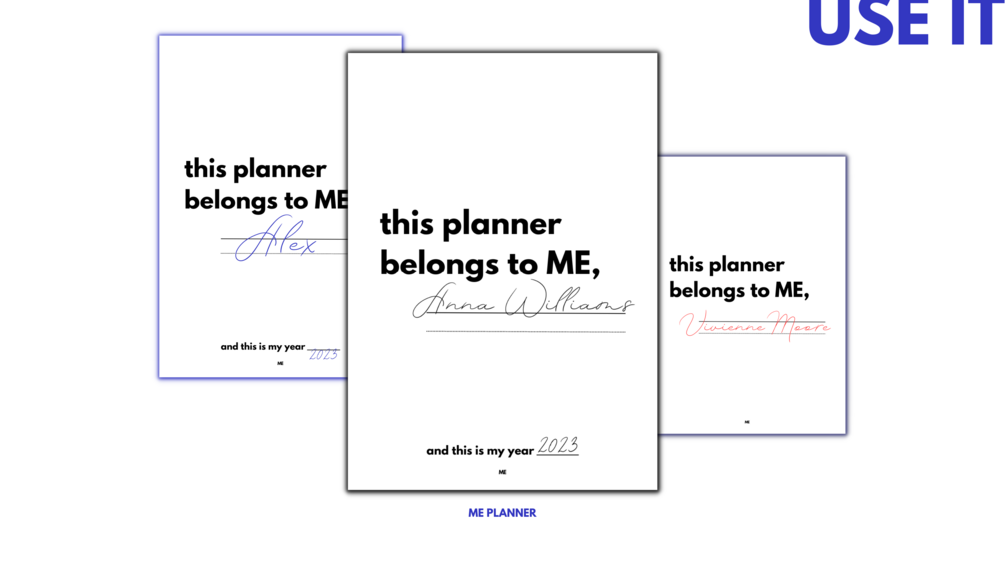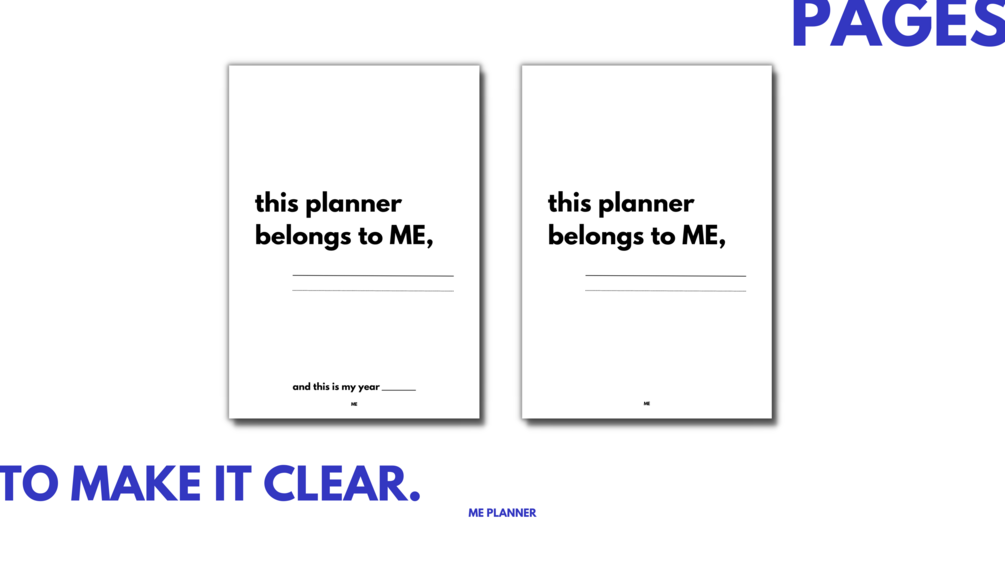 Pages where you sign your ME Planner with your name. From this page begins the design of your planner. Planner, that will take your life to a new level. Write your name on these pages and mark the beginning of great deeds and impeccably organized days, thoughts, plans, and life!